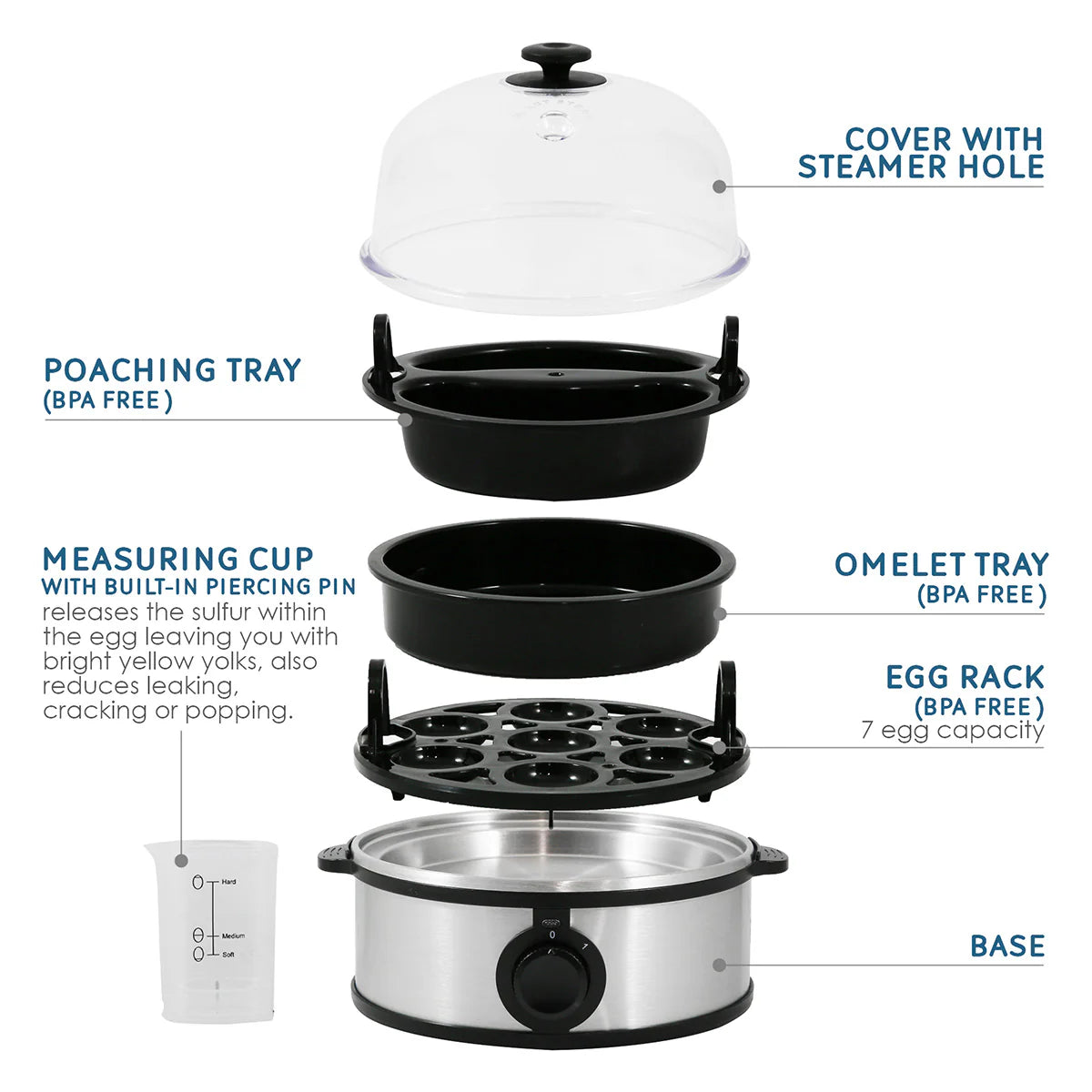 • Includes egg tray, poaching tray, omelet tray, clear lid, measuring cup and instruction manual with 16 recipes